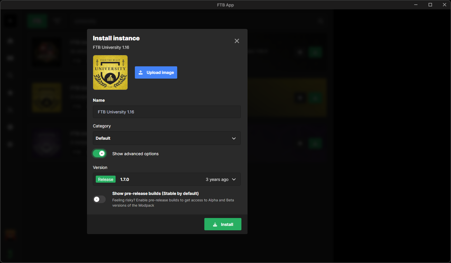 - Click on the green Install modpack button. Check Show advanced options and select the modpack version listed in the Pack column on our Connection Info page. Click Install to complete the modpack installation.